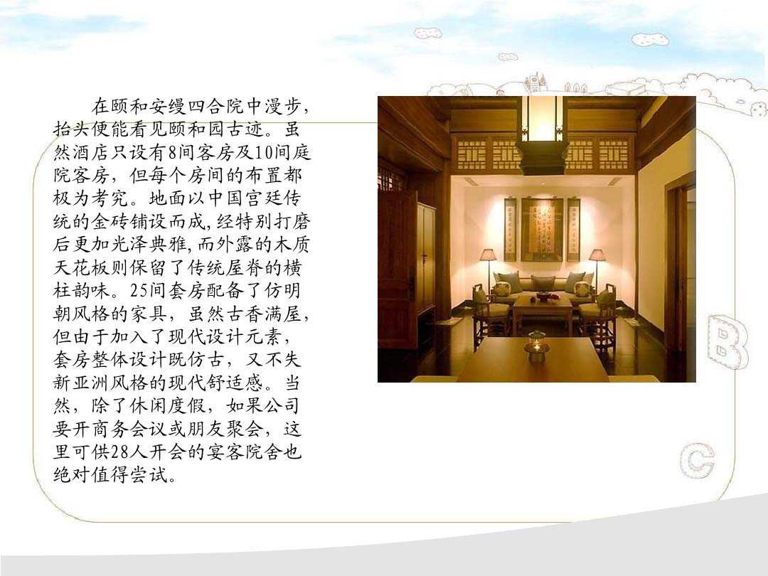 在經濟推動社會發展的時代背景下,人們可供選擇的機會也越來越多,每個人都在書寫人生的故事,而酒店業同樣在書寫屬于它自己的故事。人們有過妄想,想要把時間留住,可是我們都明白時間是留不住的,但是在時間慢慢流逝的過程中人用另一種方式將時間定格在了某一時刻,讓之煥發光彩。在北京的這家五星級酒店中,時間留給了我們的不只是回憶,也是一種生活的品味、精神的享受、對人生價值觀念的追求。就請大家欣賞一下這家來自北京的安縵頤和酒店圖文帶給我們的不一般的感受。