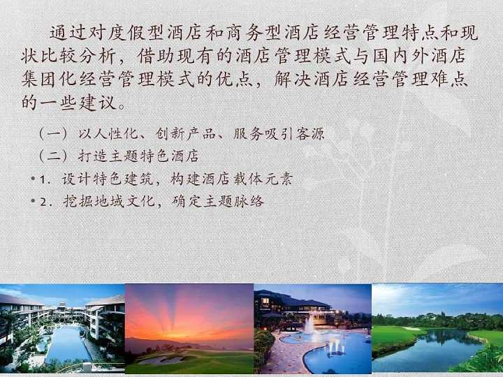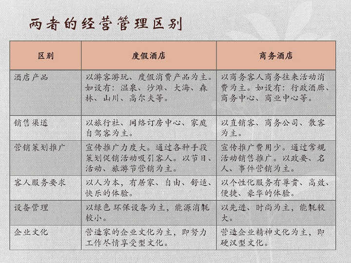 目前,在市場上的酒店可謂是琳瑯滿目、層出不窮,各種商務酒店、度假酒店、精品酒店、主題酒店分得出酒店類型的和分不出酒店類型的比比皆是。那么,對于商務酒店和度假酒店兩者之間您又了解多少呢?