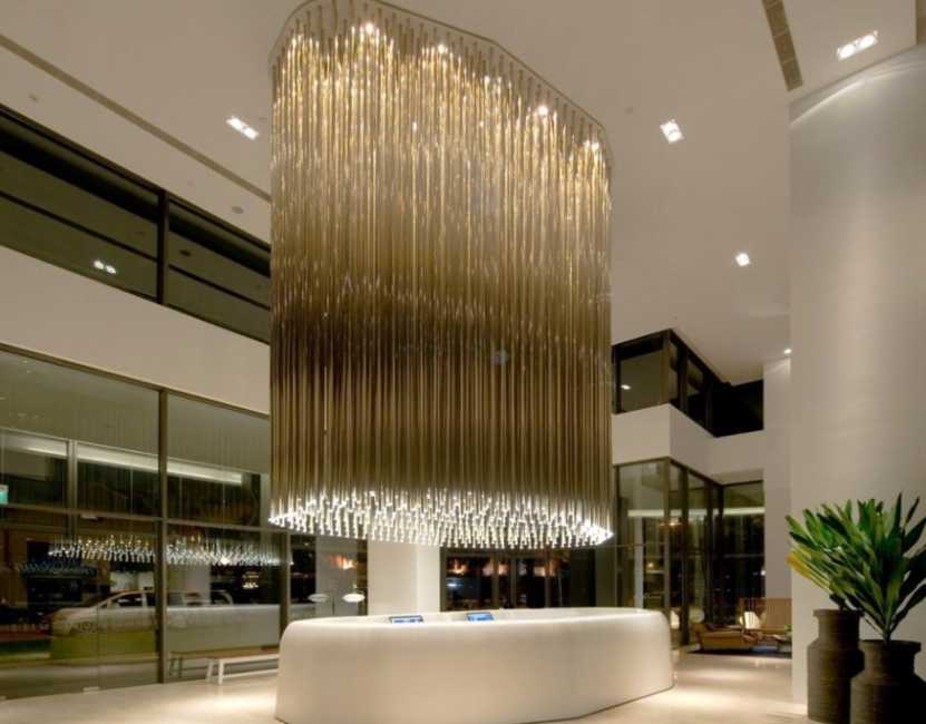 發布人:水木源創設計 發布時間:2020.02.12當今的酒店建筑設計中,大堂空間大致可分為水吧、大堂主廳、總服務臺和休息廳四個區域,不同的區域應遵循不同的照度標準要求。而設計師在大堂空間的光環境設計中,很容易模糊了不同區域所需光環境的芝異性,只在宏觀上做調控,忽視了細節區域的氣氛營造,使大堂空間的整體效果趨于平談。無趣。在具體操作上,體現在光源的運用缺少針對性、不夠講究,導致燈具造型或光源的顯色性,照度及色彩與空間氛圍不協調,燈具的布置不合理,最終造成大堂內亮度分布缺少層次。或層次的主體不顯著。