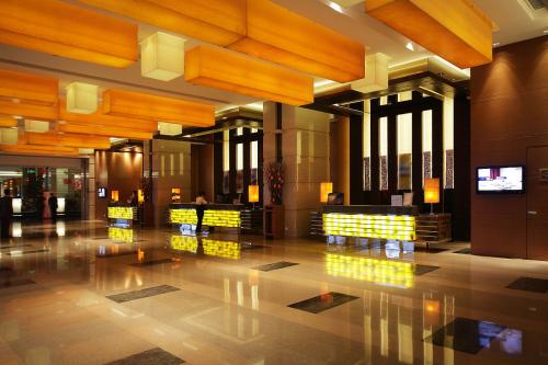 總服務臺部分,現在總服務臺已淘汰傳統的設計,而是以島式結構來替代。這樣的設計在長度上可達到十余米,并把很多商務服務集中于此,給客人全面的服務。