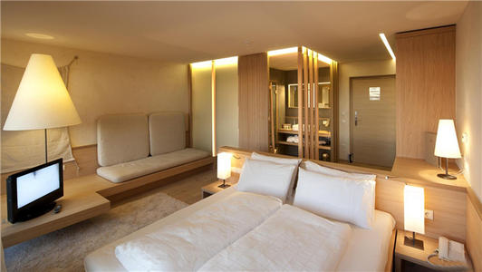 4、家具:考慮到投資成本上的控制,一般現(xiàn)代派酒店客房較少采用全實木家具,建議使用表面為天然材質的人造板結合實木制作或人造板結合金屬、石材、玻璃等材料。寫字臺、電視柜、行李柜、床頭柜、茶幾等平整的臺板和立面部分的表層主要使用人造板,收邊和腳、腿等支撐或獨立部分使用實木;切忌再在臥室中使用化妝鏡,試問:按以往設計的昏暗的客房里,有哪位女士會坐在臥室的化妝鏡前化妝而不到明亮的衛(wèi)生間里的大面鏡子跟前?另外,從風水的角度說,中國人是最忌諱鏡子對著床的;全身鏡也不要設計在臥室中;有相當數(shù)量的五星級酒店,其客房床頭一面的墻壁上也對稱型地設計了局部鏡面,有的是靠近頂棚的一塊長方型,有的是分立兩床頭柜上方。按風水講,臥室有鏡面不利;第二:容易讓人產生幻覺受驚嚇;第三:容易損壞不方便維修;第四:可能會對客人造成人身傷害;所有家具的角都應做成鈍角或倒成圓角;床靠背不做成固定軟靠式,否則不易清洗。