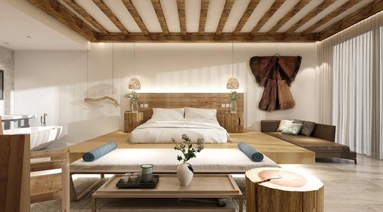 客房是為客人提供休息服務的地方,在設計時主要應在兩個方面入手。一是要注重設計成本的控制,可以考慮采用新舊對比的方式,保留一部分原有材料。二就是要注重實用性,不必要進行過多復雜的設計,干凈整潔即可。比如簡簡單單的白墻,搭配一些讓人舒適的木飾面材料讓空間既浪漫又溫馨。