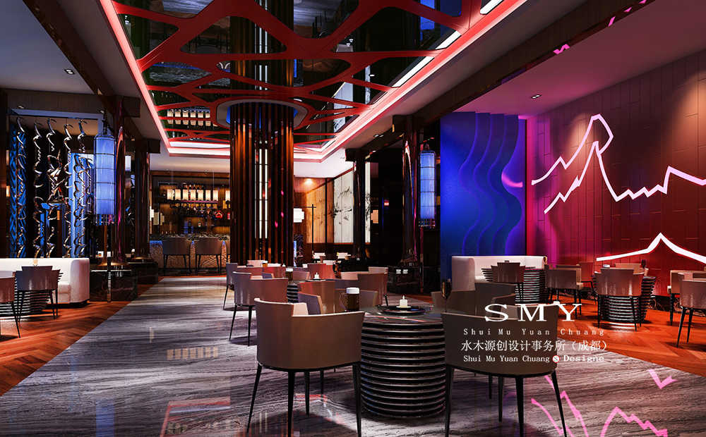 迷幻空間使追求神秘、新奇、迷幻、動感和趣味的空間類型,通常用夸張、扭曲、錯位、倒置等反常規設計方法是空間變幻莫測、動感趣味,照明追求五光十色、動感變換,色彩突出濃艷嬌媚、裝飾陳設不拘一格等。