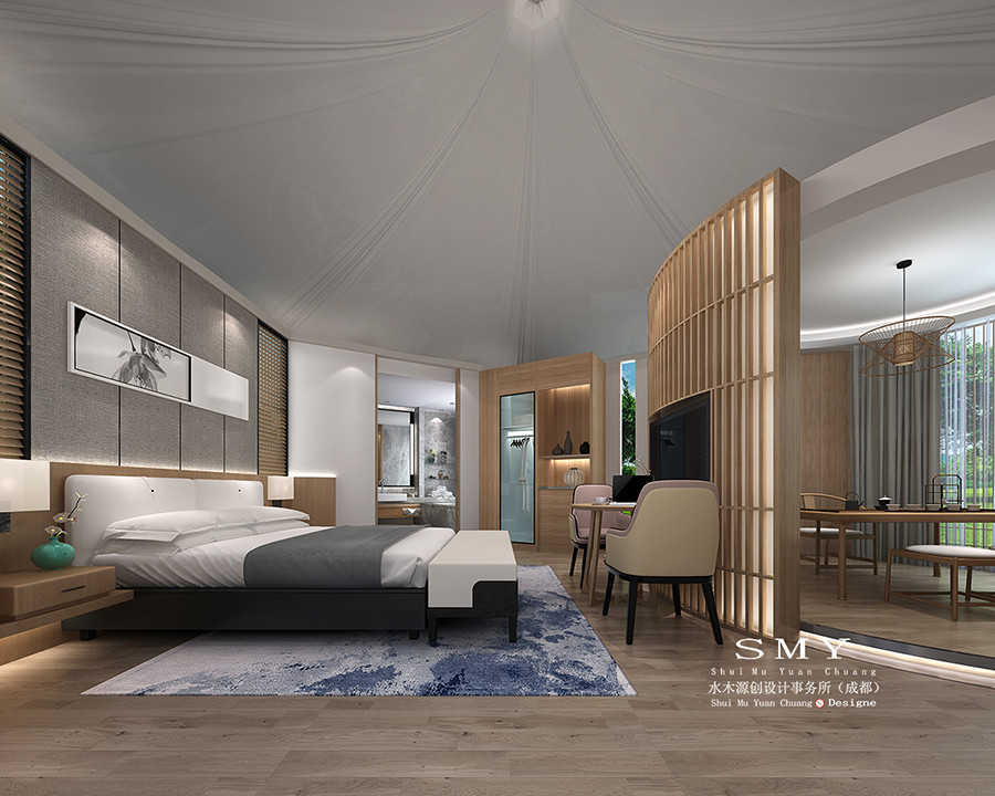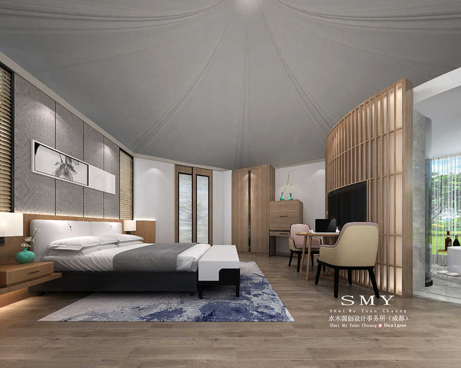 本案禪意帳篷酒店設計風格為后現代中式,帳篷屋內主要功能分區為:大床房、獨立衛生間、獨立淋浴房、獨立浴缸、獨立休閑區等。
