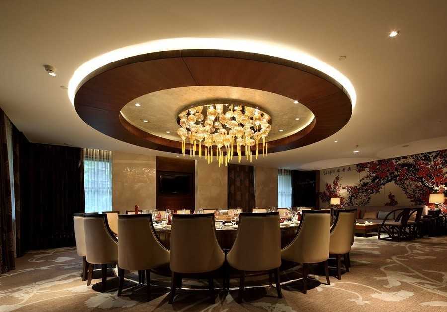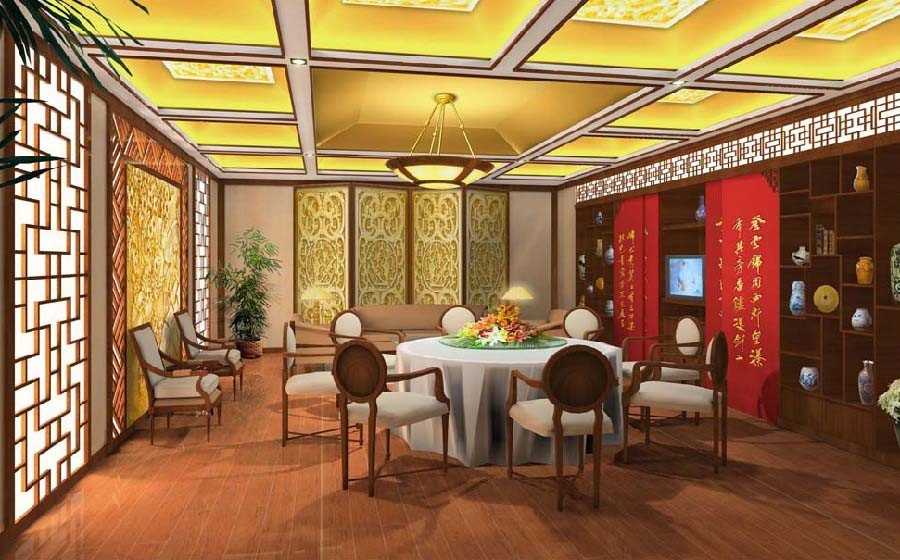 新中式酒店中的餐廳包廂設計,最具特色的便是桌椅、屏風、吊頂等裝飾方式,在豪華包廂中常常會有獨立的品茶休閑區,傳統中式風格設計可能是,方圓規矩的紅木家具茶幾和座椅,但在新中式設計中,往往設計采用現代化的材料和設計,以矮腳板凳為代表。在用餐座椅的設計中,大圓桌取代了傳統中式的長方桌。現代中式風格的酒店包廂在吊頂方面的設計,有一部分沿用了傳統中式的方正式吊頂,而現代新中式中更多的吊頂會用到流線型的吊頂方式。