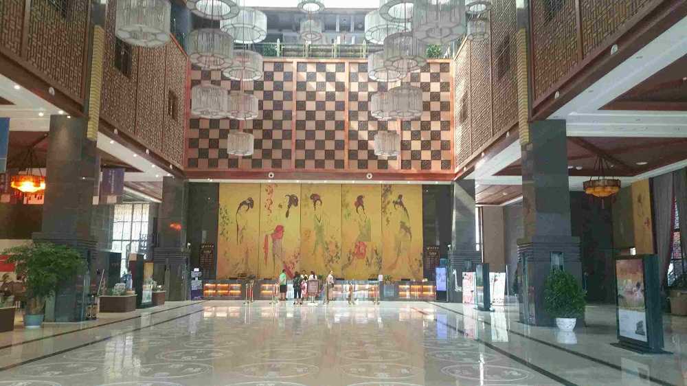 酒店的內(nèi)部采用女皇富饒時期的風格,進門一龍一鳳的金屬雕塑,寓意當年二圣臨朝。主樓一層為接待大堂,地磚采用定制的銅錢紋樣,墻面鐫刻女皇執(zhí)政時期創(chuàng)造的文字,頂面奢華的燈具排列為“曌”字,象征日月凌空,普照大地。洗浴等待和休閑飲茶等區(qū)域的細節(jié)設(shè)計也極具宮廷氣質(zhì)和中式韻味,青瓦木梁,長圓門洞,石體浮雕和木質(zhì)鏤空隔斷,搭配造型別致的宮燈和絲綢簾幕,讓人仿佛身置古代。將牡丹、佛像、錦鯉等意向融入設(shè)計,墻面飾有仕女圖、山河景等壁畫,讓人恍然夢回唐朝。古香古色的空間與一些現(xiàn)代材質(zhì)協(xié)調(diào)一致,營造出酒店綜合體華麗大氣的舒適氛圍。